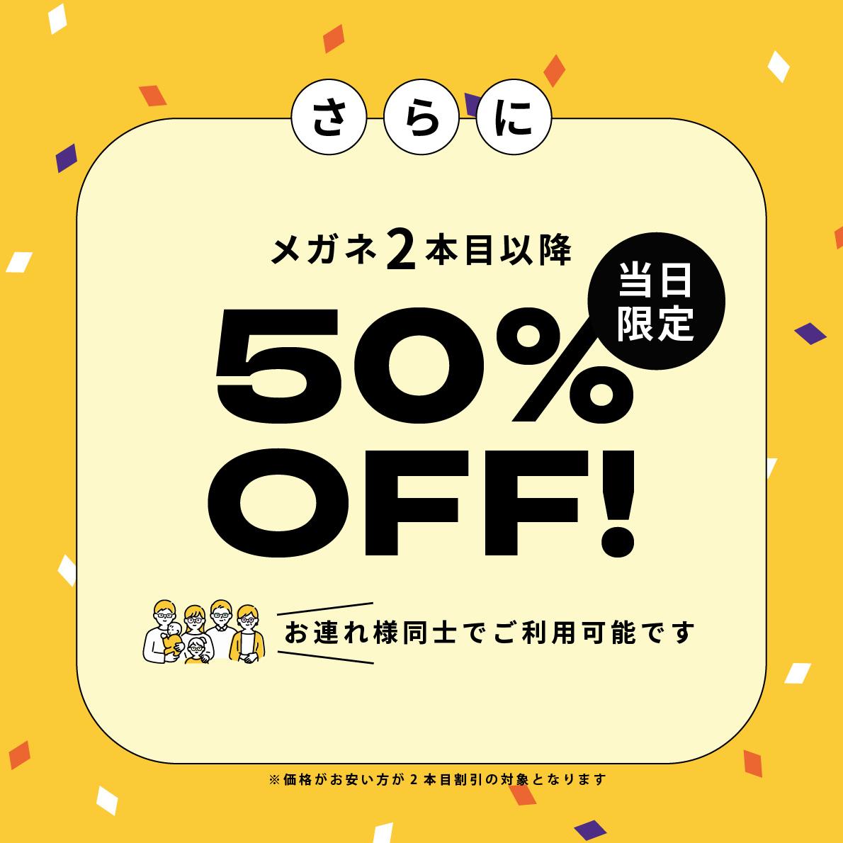 上記2本目以降50%オフセールは、ご本人様以外にも、ご家族・お友達・お連れ様と一緒にご利用いただけます!※2本目以降50%オフは価格がお安い方から割引