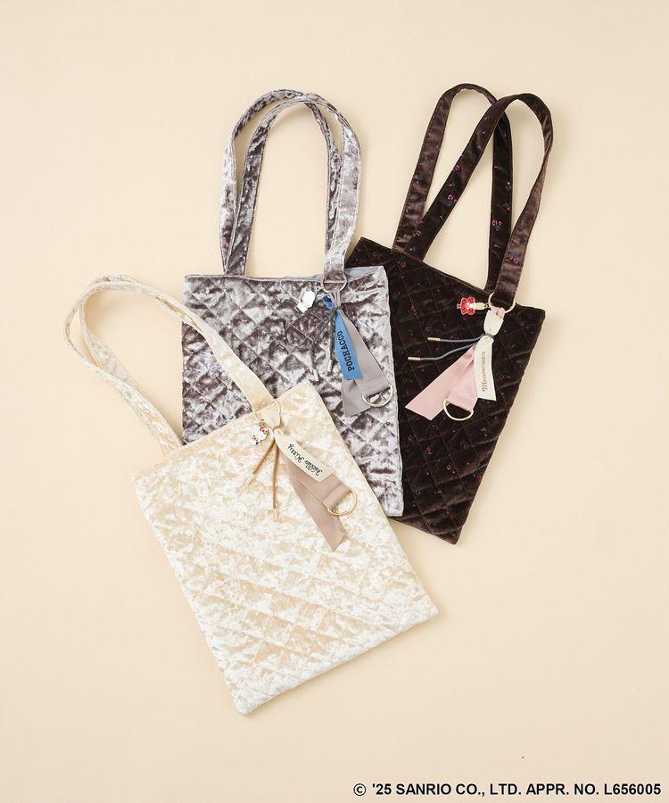 愛らしいチャームとリボンアクセントがポイントのトートバッグ。トレンド感のあるベロアキルティング生地が存在感を上げてくれる普段使いに最適なひと品です。肩掛けが可能な長めの持ち手とスクエアフラットの使い勝手の良いデザイン。シンプルでスタイリングに合わせやすく、様々なシーンで重宝するおすすめのアイテムです。