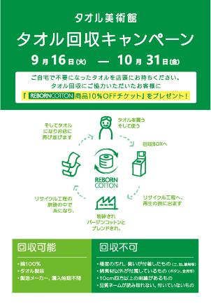 タオル美術館では、SDGsの取り組みとして不要になったタオルの回収BOXを店舗に設置し、タオルの回収キャンペーンを期間限定で開催しています!!