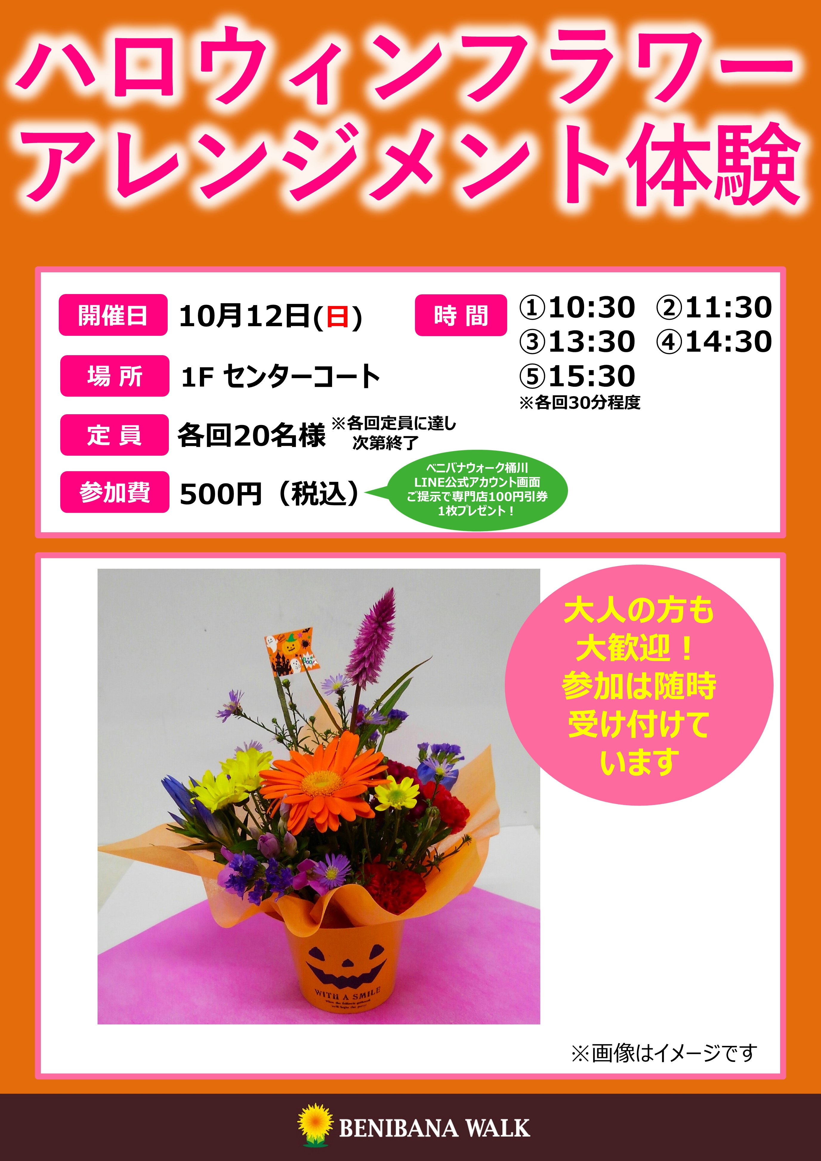 ベニバナウォークでは、「ハロウィンフラワーアレンジメント体験」を開催します!
