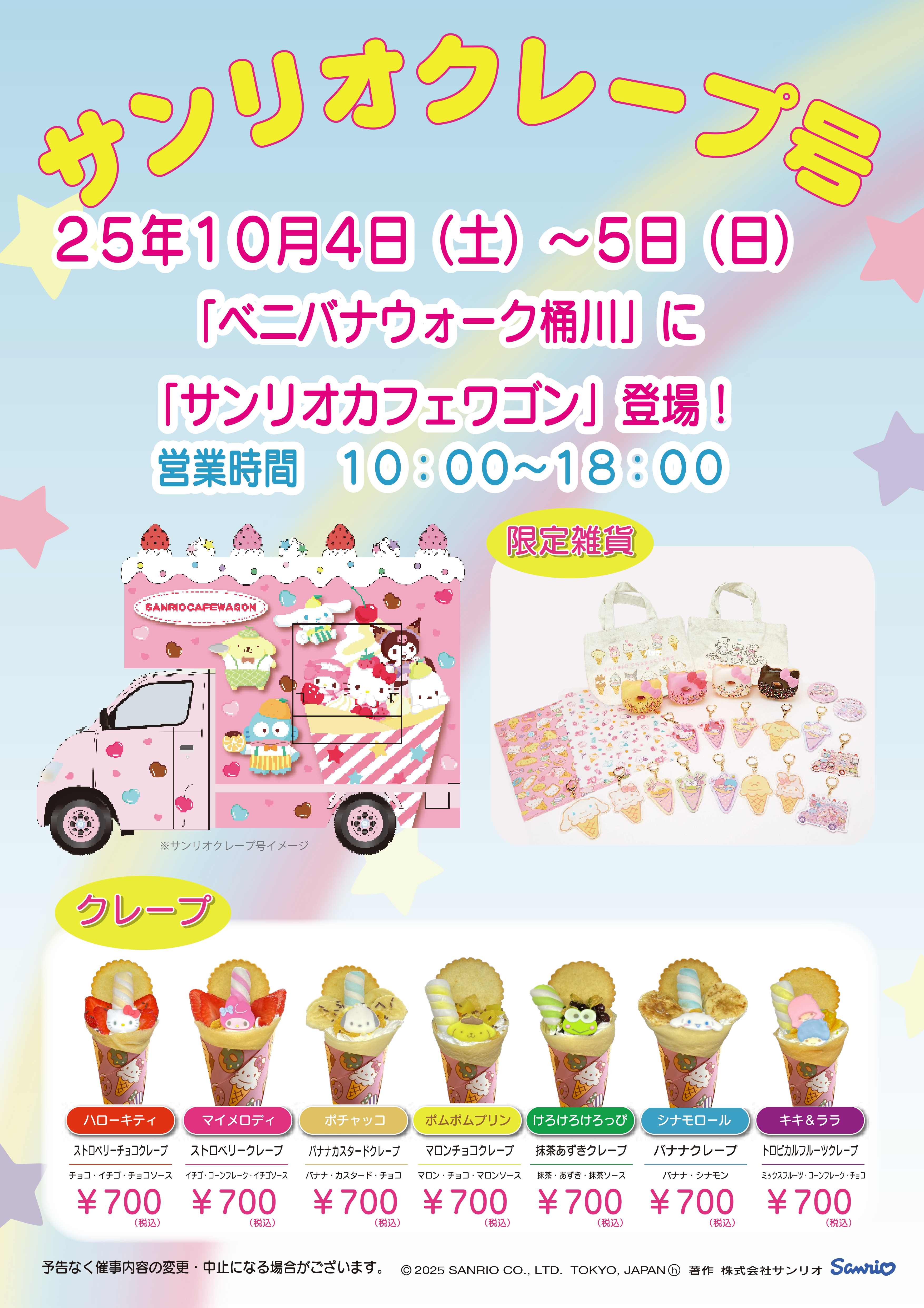 かわいいキャラクターたちがデザインされたクレープと限定グッズを販売する「サンリオカフェワゴン」が、10月4日(土)、5日(日)の2日間限定でベニバナウォーク桶川にやってきます!