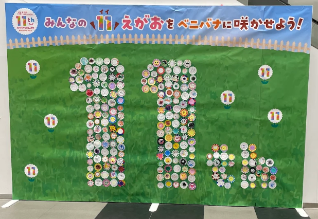 会場では、皆様に描いていただいた「えがおの塗り絵」が、大きな「11」のモザイクアートとなって登場しました!