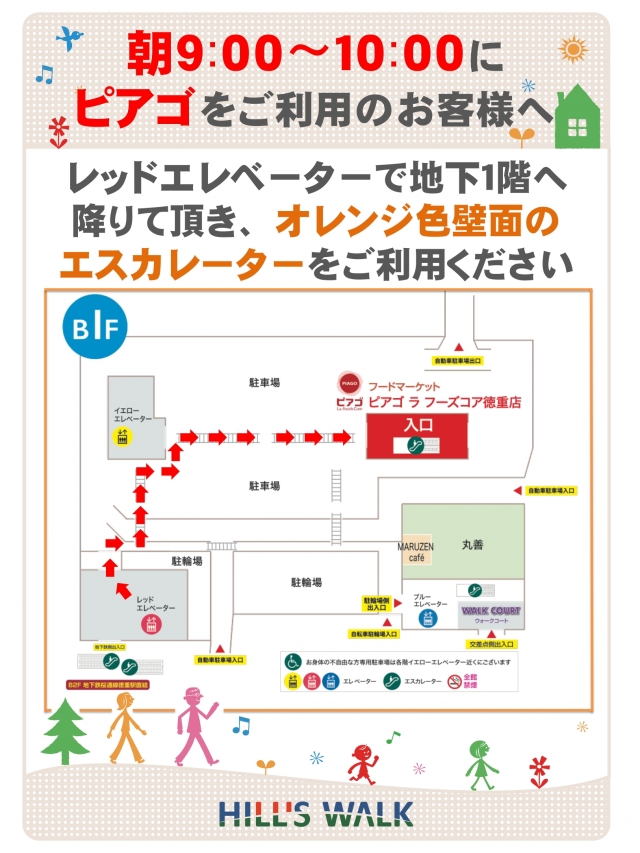 立体屋上駐車場にお車を停めてピアゴ食品売場をご利用のお客様は、レッドエレベーターで地下1階へ降りていただき、オレンジ色壁面のエスカレーターをご利用ください。