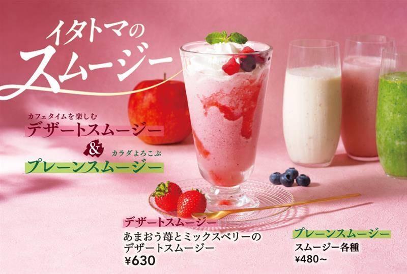 「あまおう苺とミックスベリーのスムージー」に、ホイップクリームとソース、ベリーをトッピングしたデザート仕立てのスムージーです。