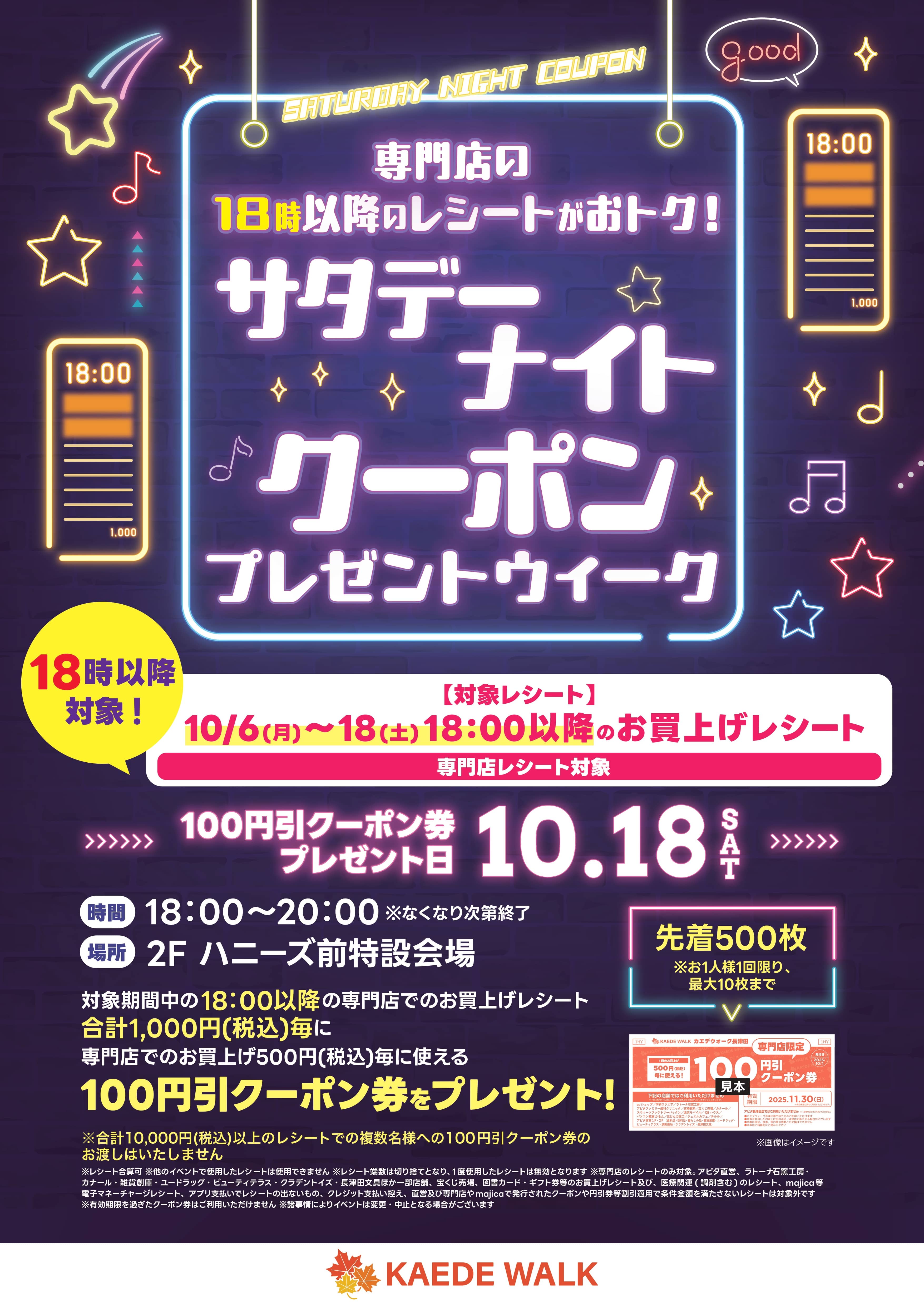 【専門店レシート対象】サタデーナイトクーポン プレゼントウィーク 18時以降のレシートが対象!