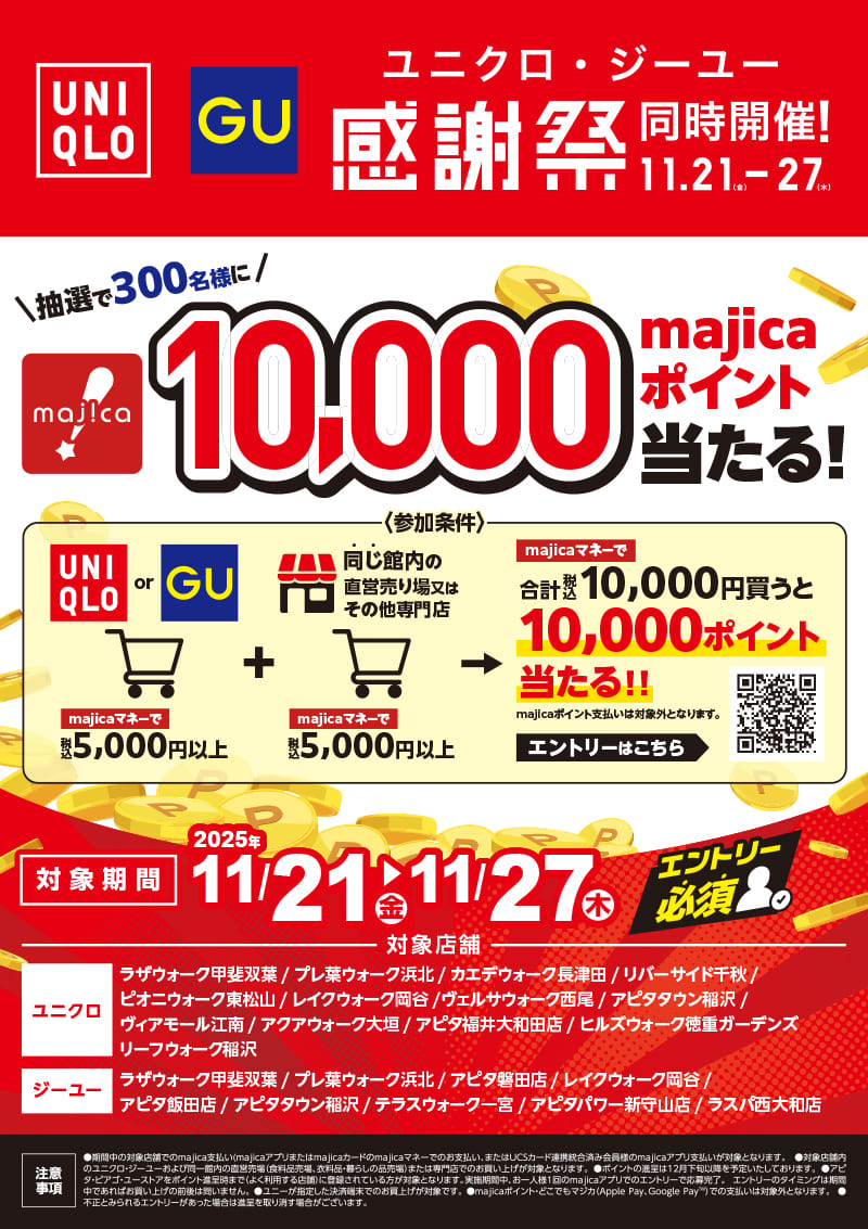 ユニクロ・ジーユー感謝祭同時開催!抽選で300名様に10,000majicaポイント当たる!