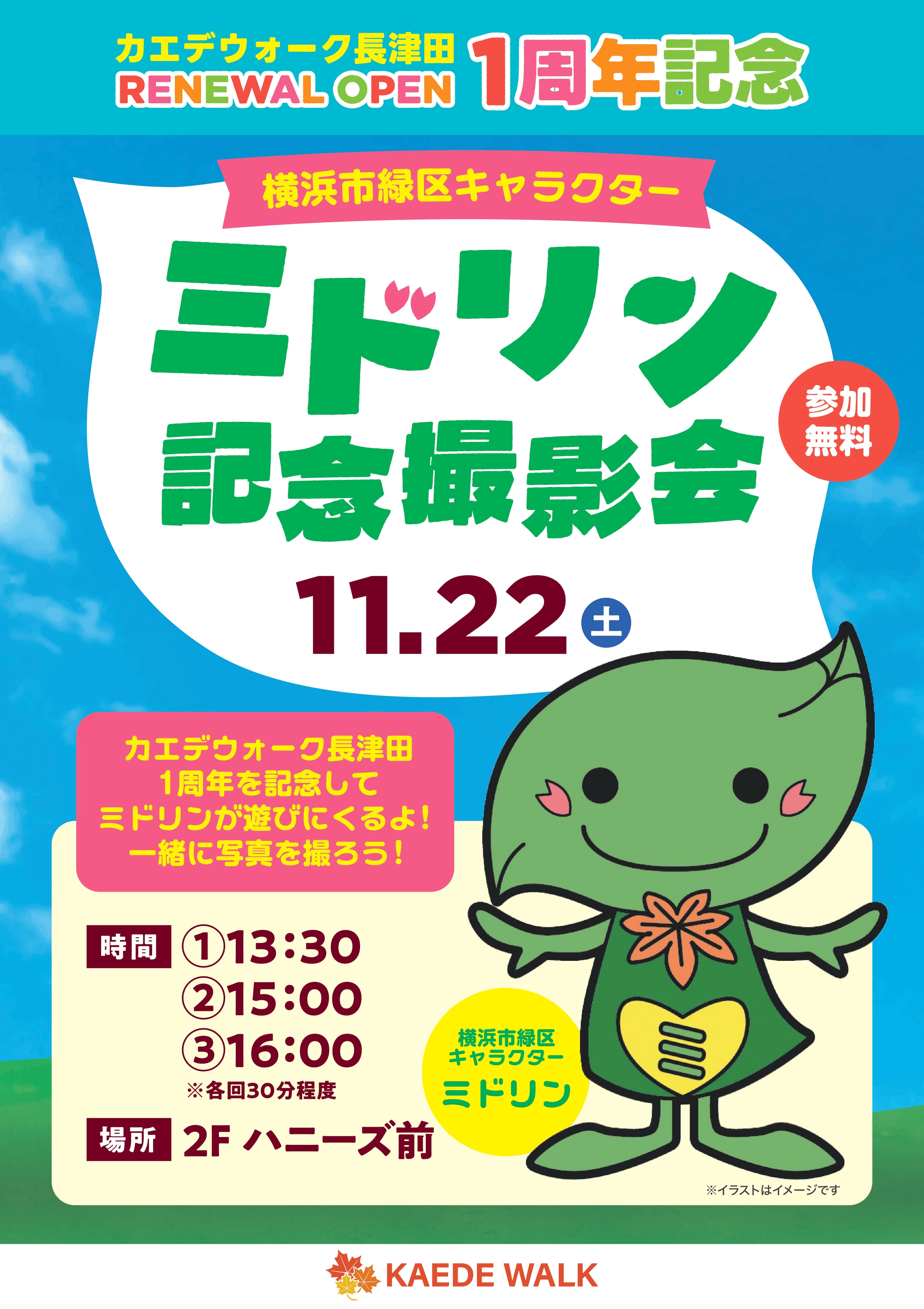 【カエデウォーク長津田 リニューアル1周年記念】緑区のキャラクター「ミドリン記念撮影会」参加無料!