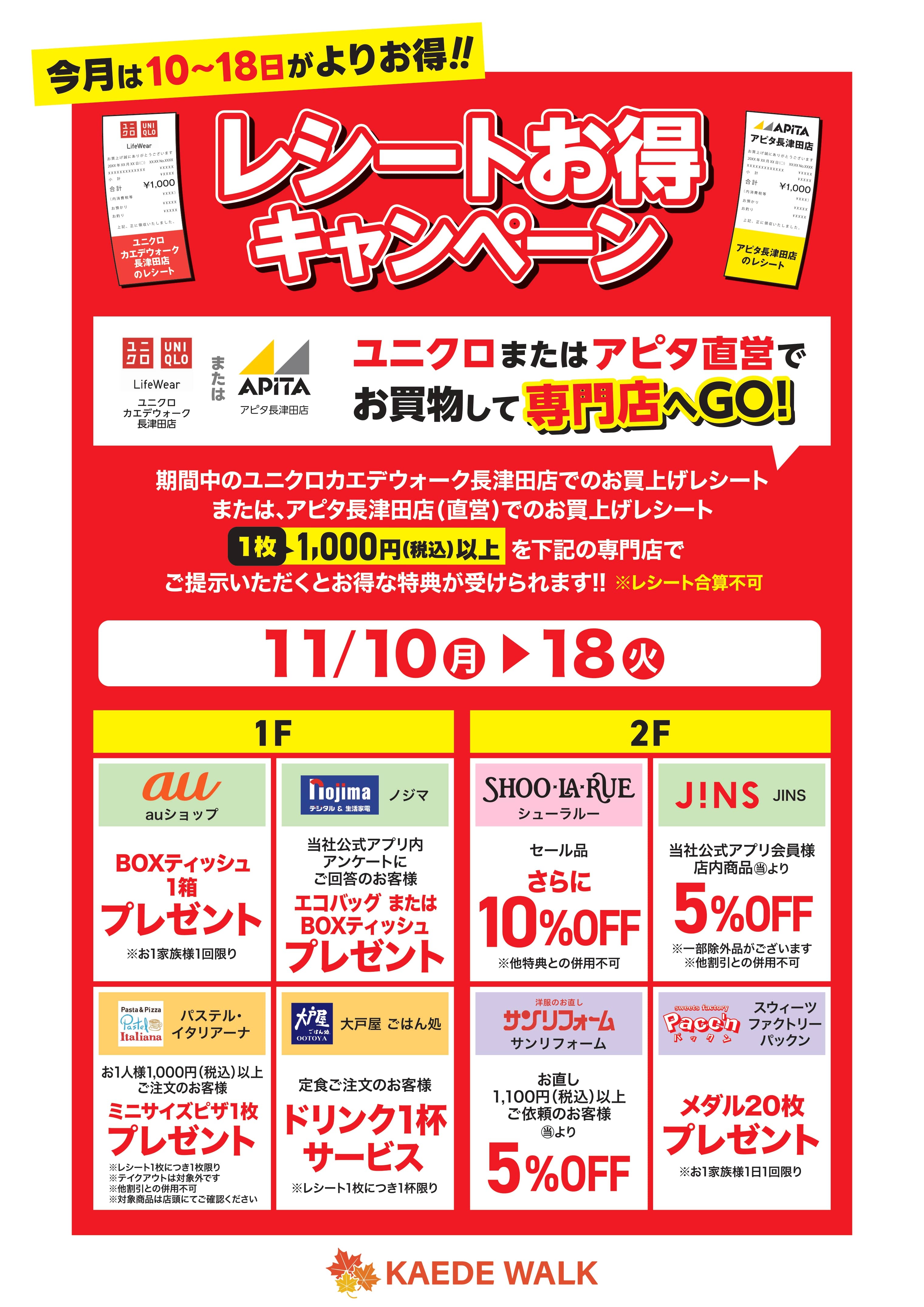 【今月は10日▶18日がよりお得!レシートお得キャンペーン】ユニクロまたはアピタ直営でお買物して専門店へGO!お買上げレシート 1枚1,000円(税込)以上をご提示でお得な特典!