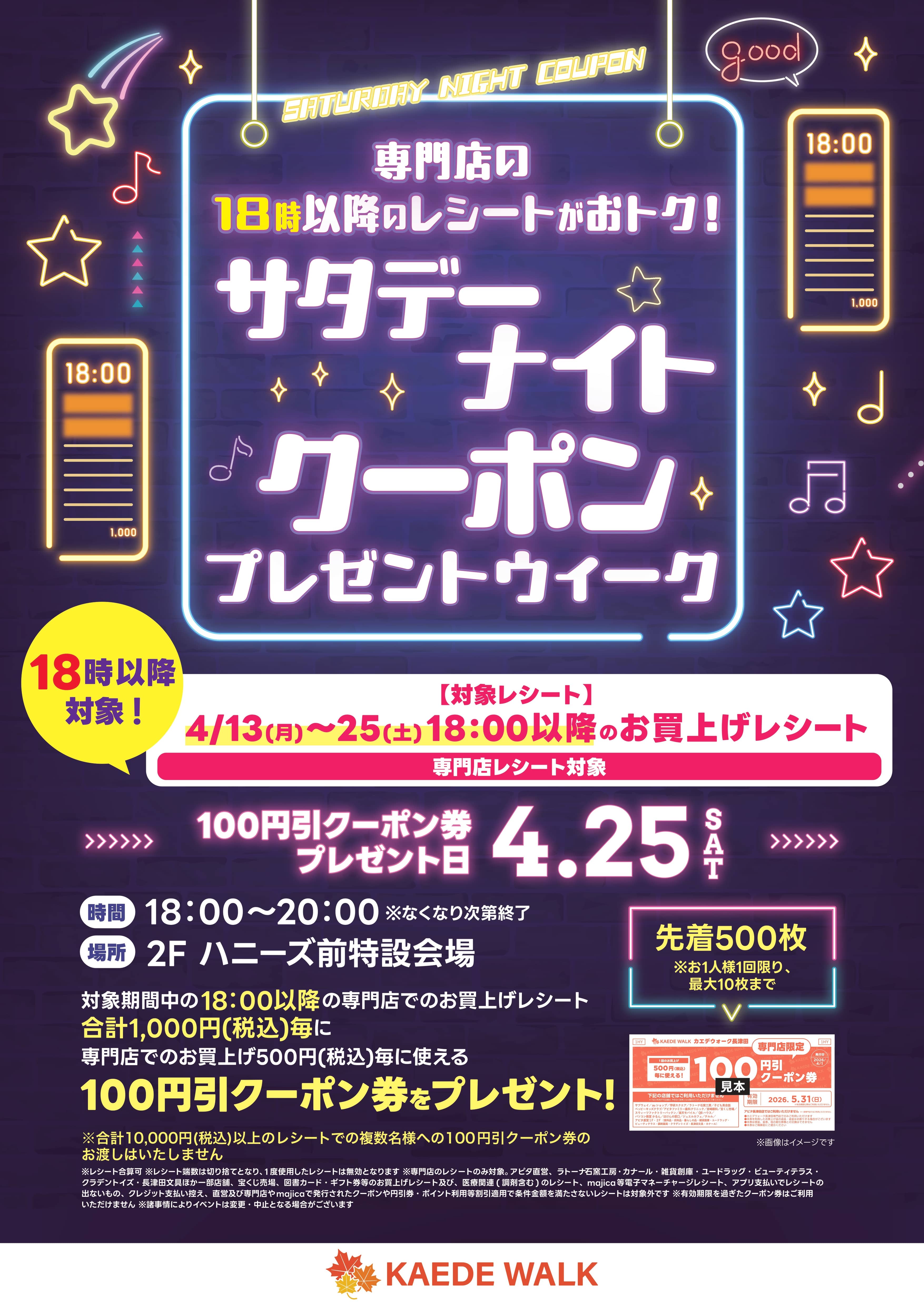 【専門店レシート対象】サタデーナイトクーポン プレゼントウィーク