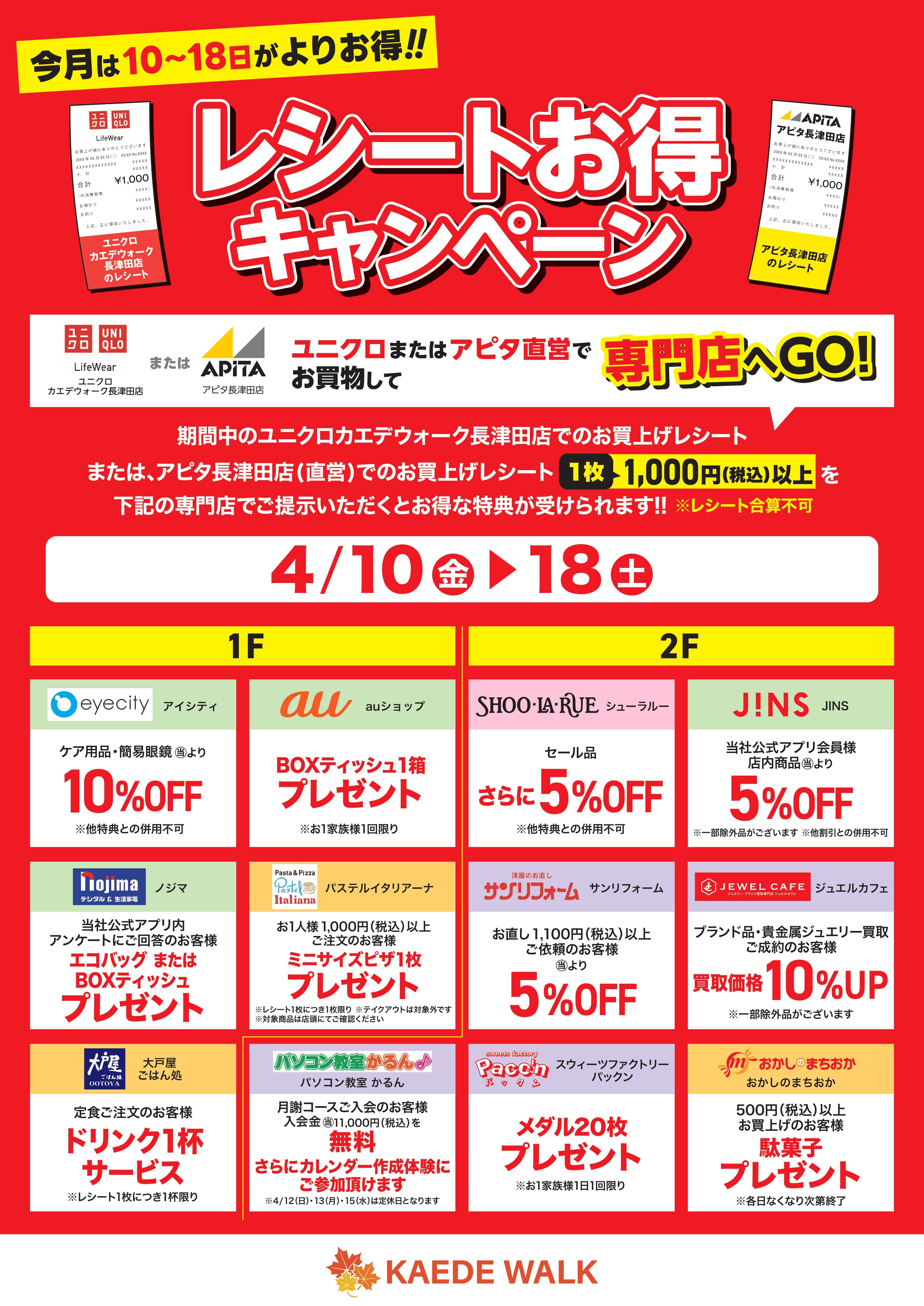 【今月は10日▶18日がよりお得!レシートお得キャンペーン】ユニクロまたはアピタ直営でお買物して専門店へGO!お買上げレシート 1枚1,000円(税込)以上をご提示でお得な特典!