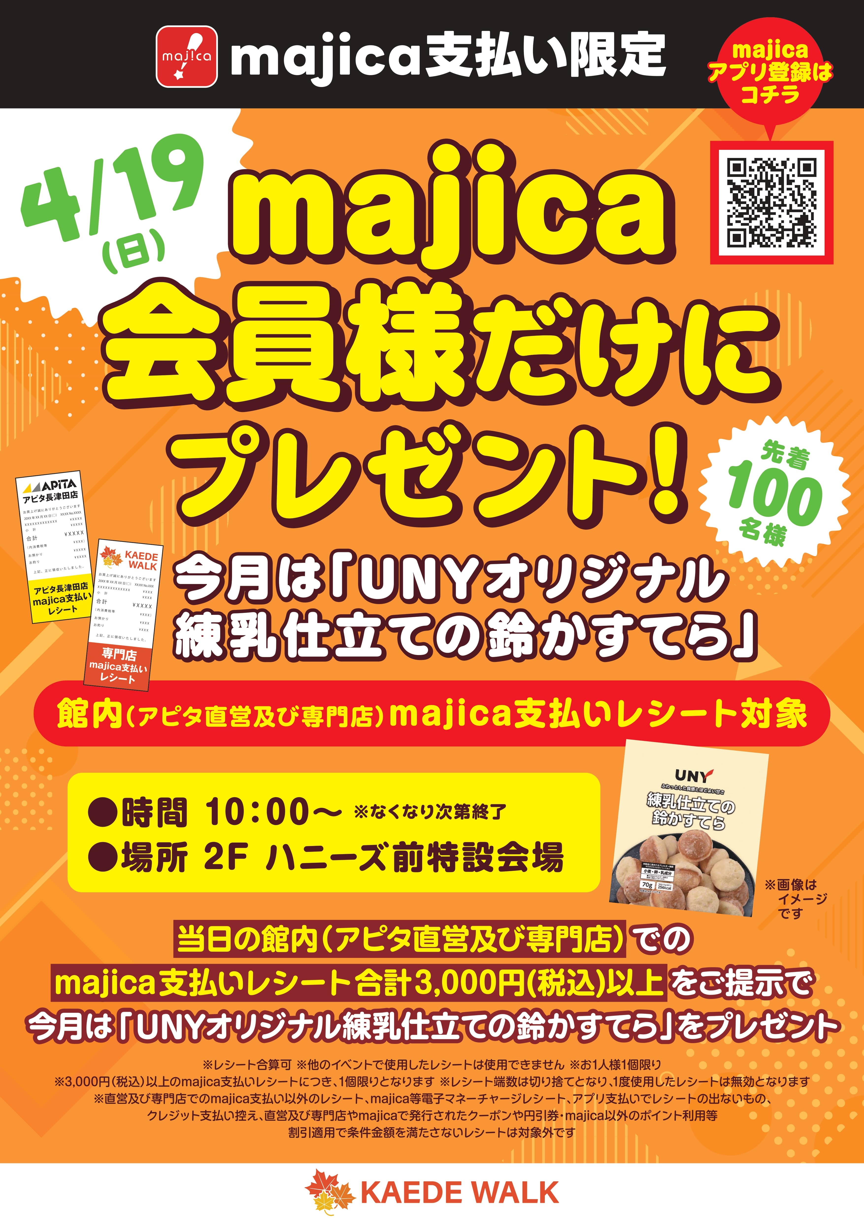 【majica支払い限定】【アピタ直営及び専門店レシート対象】majica会員様だけにプレゼント!!今月は「UNYオリジナル 練乳仕立ての鈴かすてら」