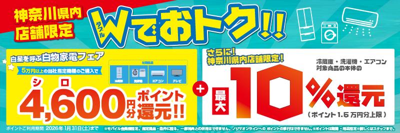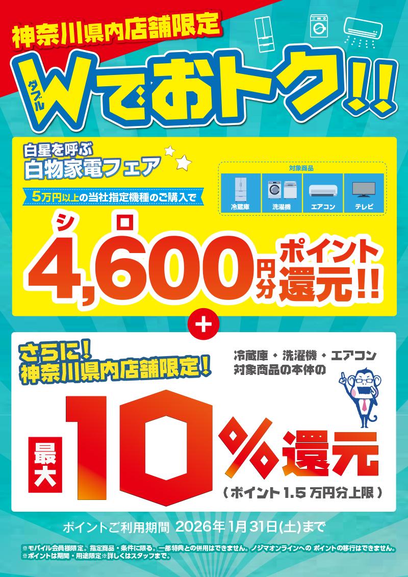 SHOP NEWS ノジマ カエデウォーク長津田 ショップニュース 「エコかな」 ノジマが補助!最大10%ポイント還元キャンペーン開催! 期間:10月04日(土)~10月31日(金) 「エコかな」 ノジマが補助!最大10%ポイント還元キャンペーン開催! 2025/10/03 掲載 神奈川店舗限定で省エネ性能の高いエアコン・冷蔵庫、および節水性能の高いドラム洗濯機を対象に、1台あたり最大10%還元(上限1万5千円分)のノジマポイントを還元する「エコかな」キャンペーンを開催いたします! また店内では横浜DNAベイスターズのV2を全力で応援させていただく応援セールも同時に開催中! 期間中はベイスターズグッズや家電が当たる抽選会も実施中! この機会に是非メーカー販売員のいないノジマで素敵なお買い物をどうぞ! SHOP DATA ショップ名 ノジマ ジャンル デジタル&生活家電 営業時間 10:00~21:00 フロア 1F フロアガイドを見る TEL 045-989-3121 このショップの詳細 SHOP NEWS ショップニュース チュチュアンナグランデ きれいを叶える★チュチュア... view more チュチュアンナグランデ 冬を先取り♪「運命のブラ」... view more チュチュアンナグランデ 透明感レベルアップ!大人気... view more チュチュアンナグランデ 今だけの可愛さ!ハロウィン... view more ABC-MART 【雑誌LEE監修】スタイリ... view more auショップ あなたのスマートフォンへm... view more 若鯱家 10/10(金)~『USポ... view more JINS 対象商品が一律20%OFF... view more