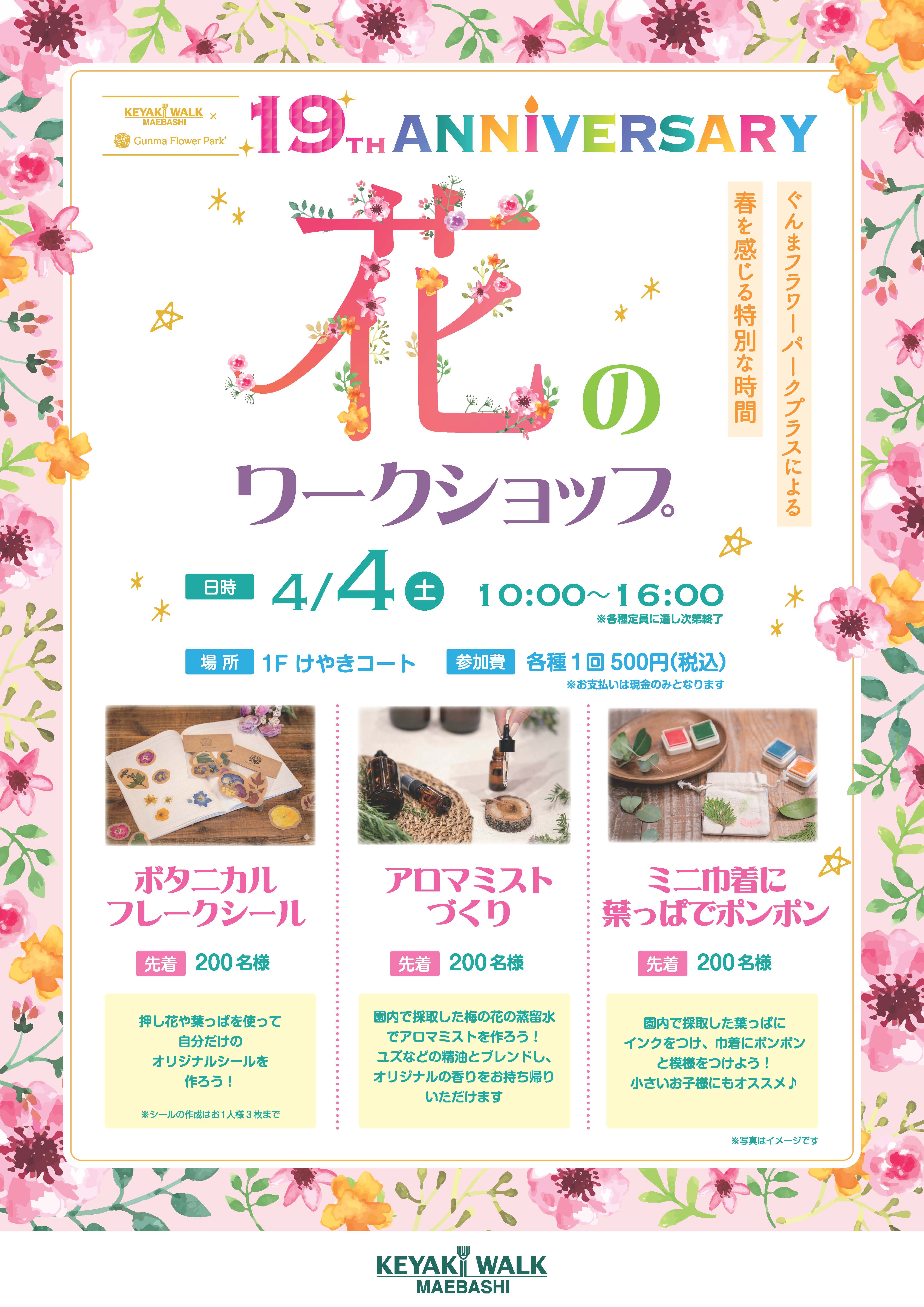 3/20(金・祝)~4/19(日)の期間中の『「Gunma Flower Park+』の入園チケット」を1Fインフォメーションにてご提示いただくと、ローズメリッサティー(2包)とけやきウォーク前橋で使える専門店お買物券(100円分×2枚)をプレゼント!
