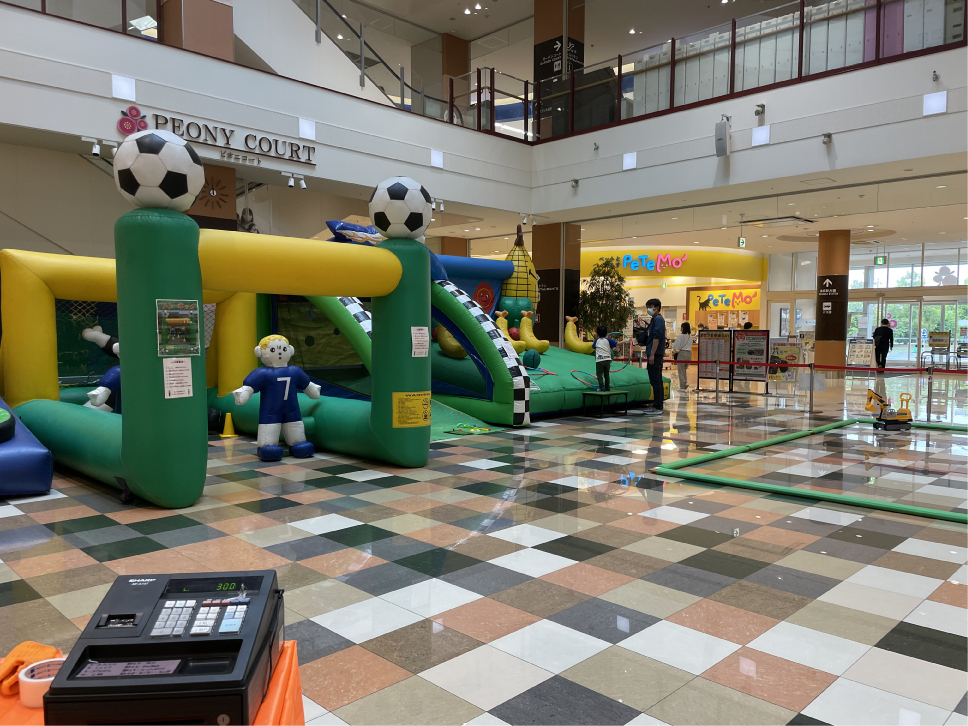 ちびっこランドは一つのエリアでフリーキック・チップインゴルフ・お手玉ビンゴ・足けり車などが遊び放題!時間内なら何度でも遊具で遊べるよ!10分で300円(税込)~