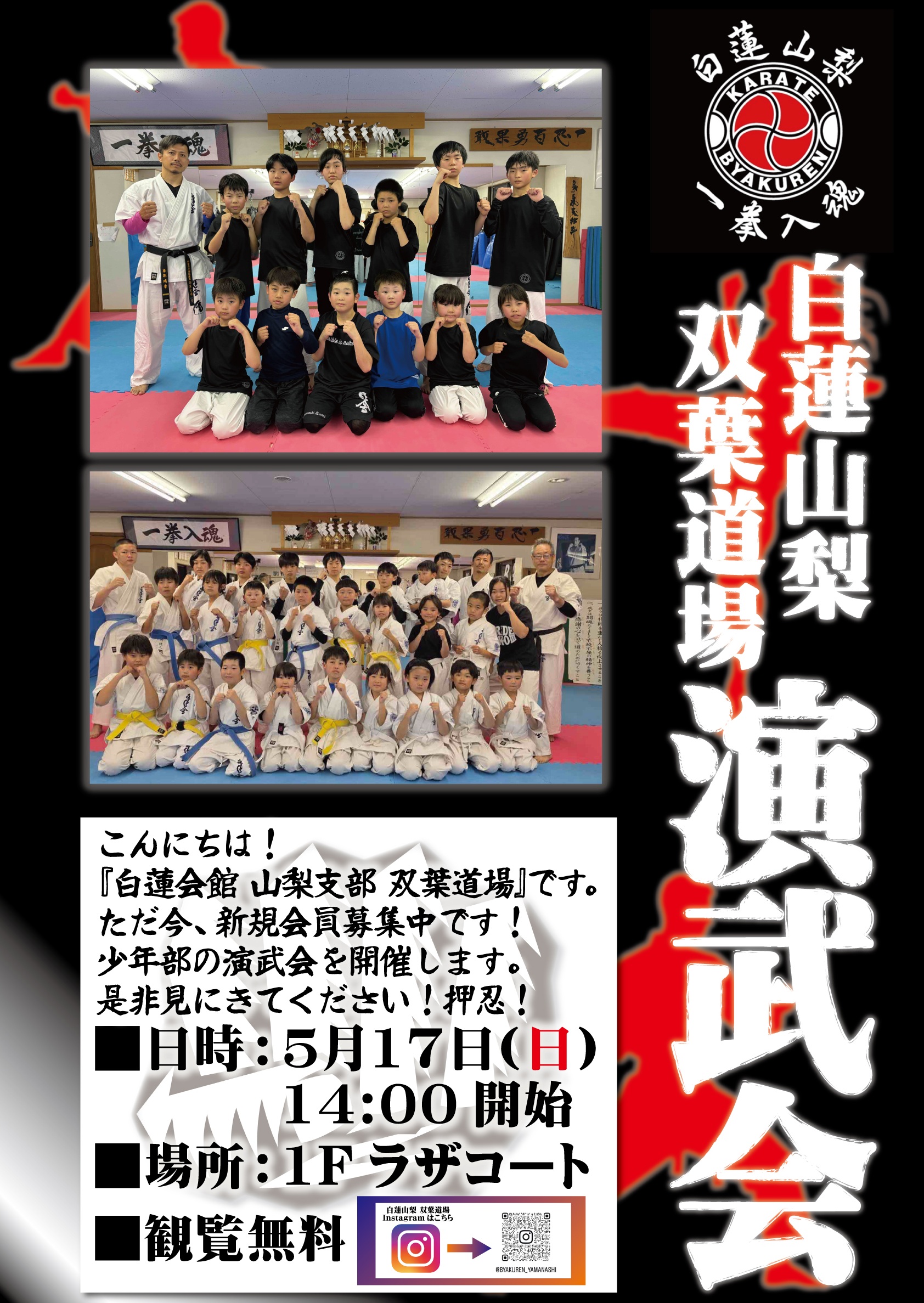 白蓮山梨 双葉道場 演武会 ラザウォーク甲斐双葉 イベント・キャンペーン 白蓮山梨 双葉道場 演武会 イベント 2026年5月17日(日) 時間:14:00~ 白蓮山梨 双葉道場 演武会 2026.04.16 掲載 観覧無料 こんにちは!『白蓮会館 山梨支部 双葉道場』です。 ただ今、新規会員募集中です! 少年部の演武会を開催します。 是非見にきてください!押忍! 開催日 2026年5月17日(日) 時間 14:00~ 場所 1F ラザコート フロアガイドを見る 開催イベント・キャンペーンは諸事情により予告なく変更する場合がございます。あらかじめご了承ください。 ショップニュース フロアガイド その他イベント・キャンペーン キャンペーン サンキューデー 時間: イベント フライデーナイトチャージ抽選会 2025年7月25日(金) 時間:16:00〜18:00 イベント UFOカー 2026年4月25日(土) 〜 時間:10:00~17:00 イベント 出張カキ小屋 牡蠣奉行 2026年4月10日(金) 〜 時間:11:00~21:00 イベント ダンボールめいろ 2026年5月05日(火) 〜 時間:10:00~18:00