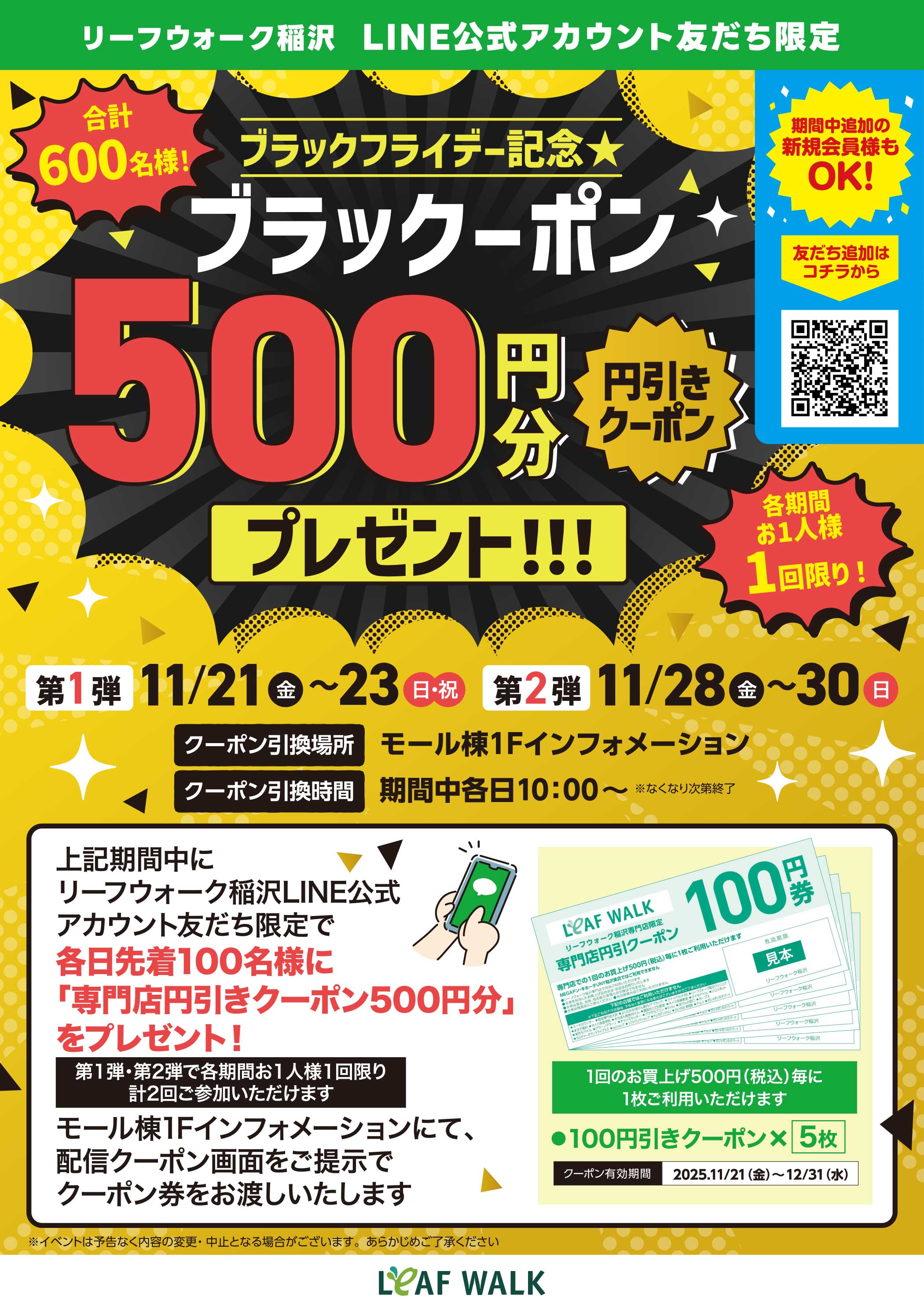 11月21日(金)~ 11月23日(日・祝)・11月28日(金)~ 11月30日(日) ※合計600名様! ※各期間お1人様1回限り!期間中各日10:00~ ※なくなり次第終了