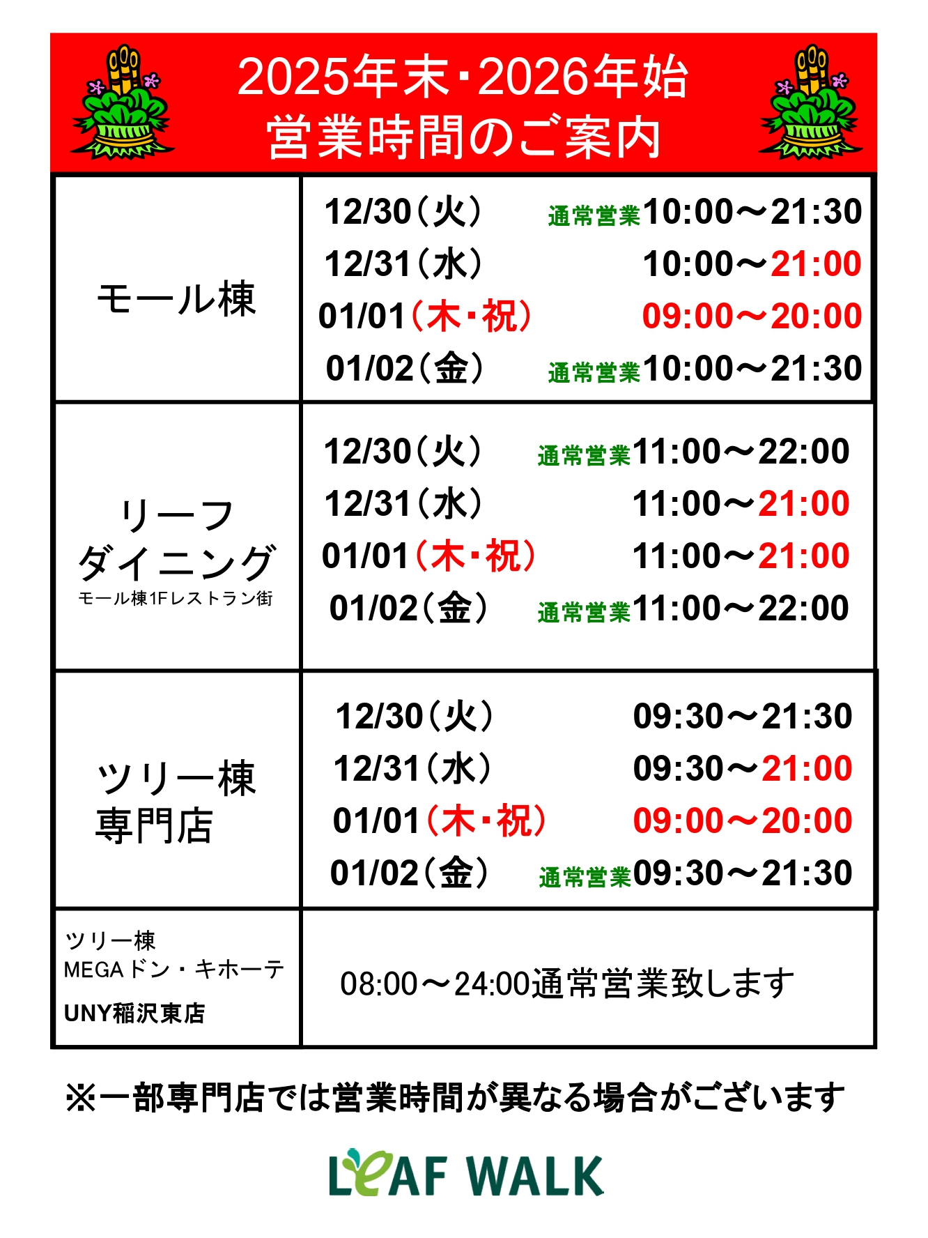 2025年 ー 2026年 年末年始 営業時間変更のお知らせ