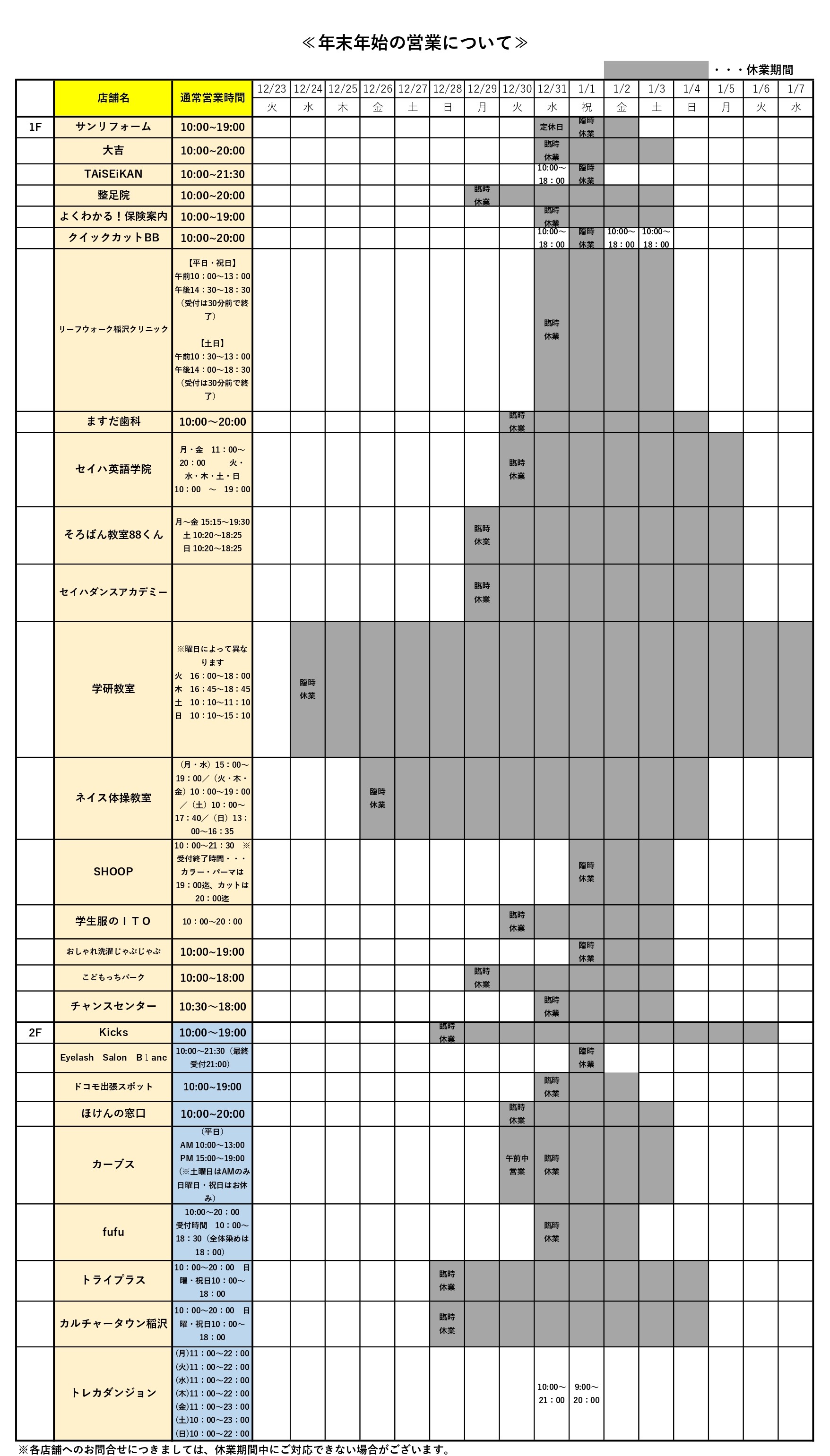 年末年始期間の営業時間を下記の通りとさせていただきます。