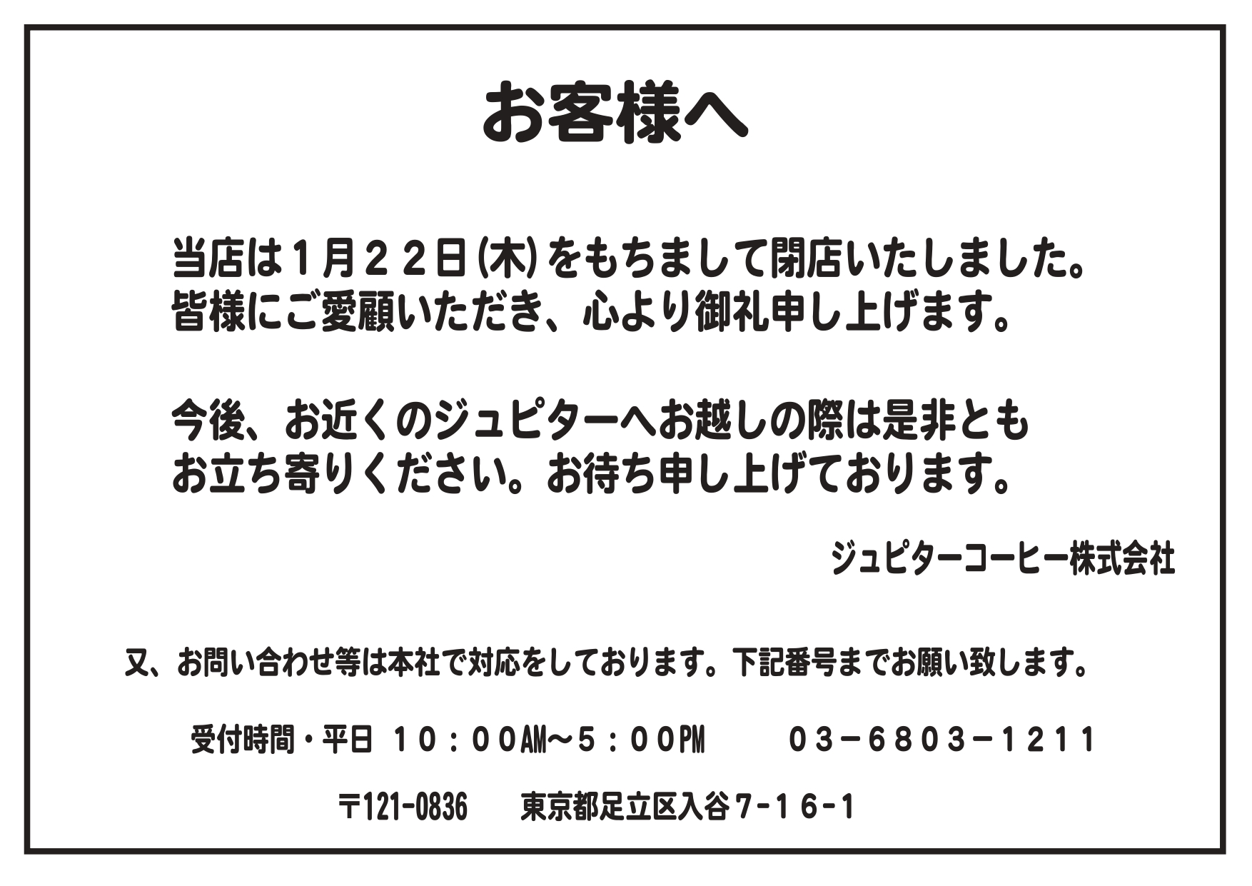 お知らせ リーフウォーク稲沢 お知らせ モール棟1階ジュピターコーヒー閉店のお知らせ モール棟1階ジュピターコーヒー閉店のお知らせ 2026/01/22 掲載 いつもリーフウォーク稲沢をご利用いただき、誠にありがとういございます。 誠に勝手ながら、モール棟1階ジュピターコーヒーは、2026年01月22日をもちまして、営業を終了させていただきました。 長らくご愛顧、誠にありがとうございました。 今後のお問合せは、画像にあります連絡先までお願い申し上げます。 お知らせ一覧