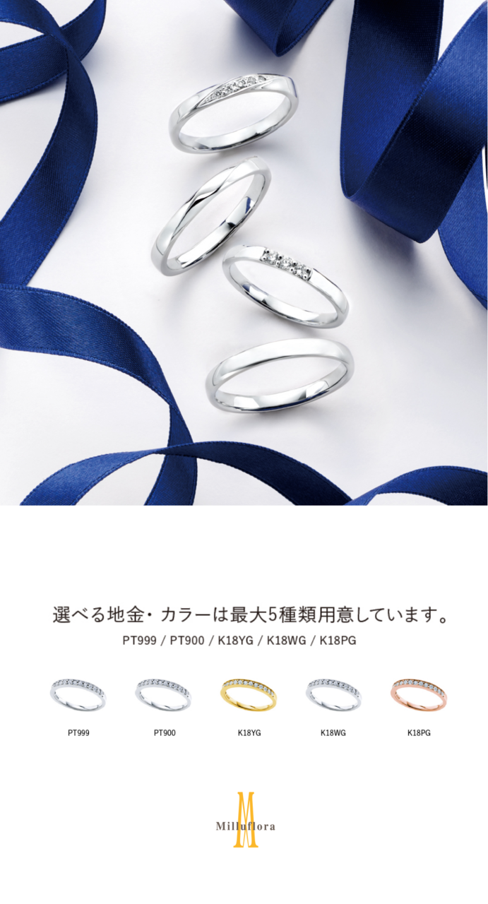 ①地金素材の変更が可能!! Pt999、Pt900、K18、K18PG、K18WGの5種類から選べます。