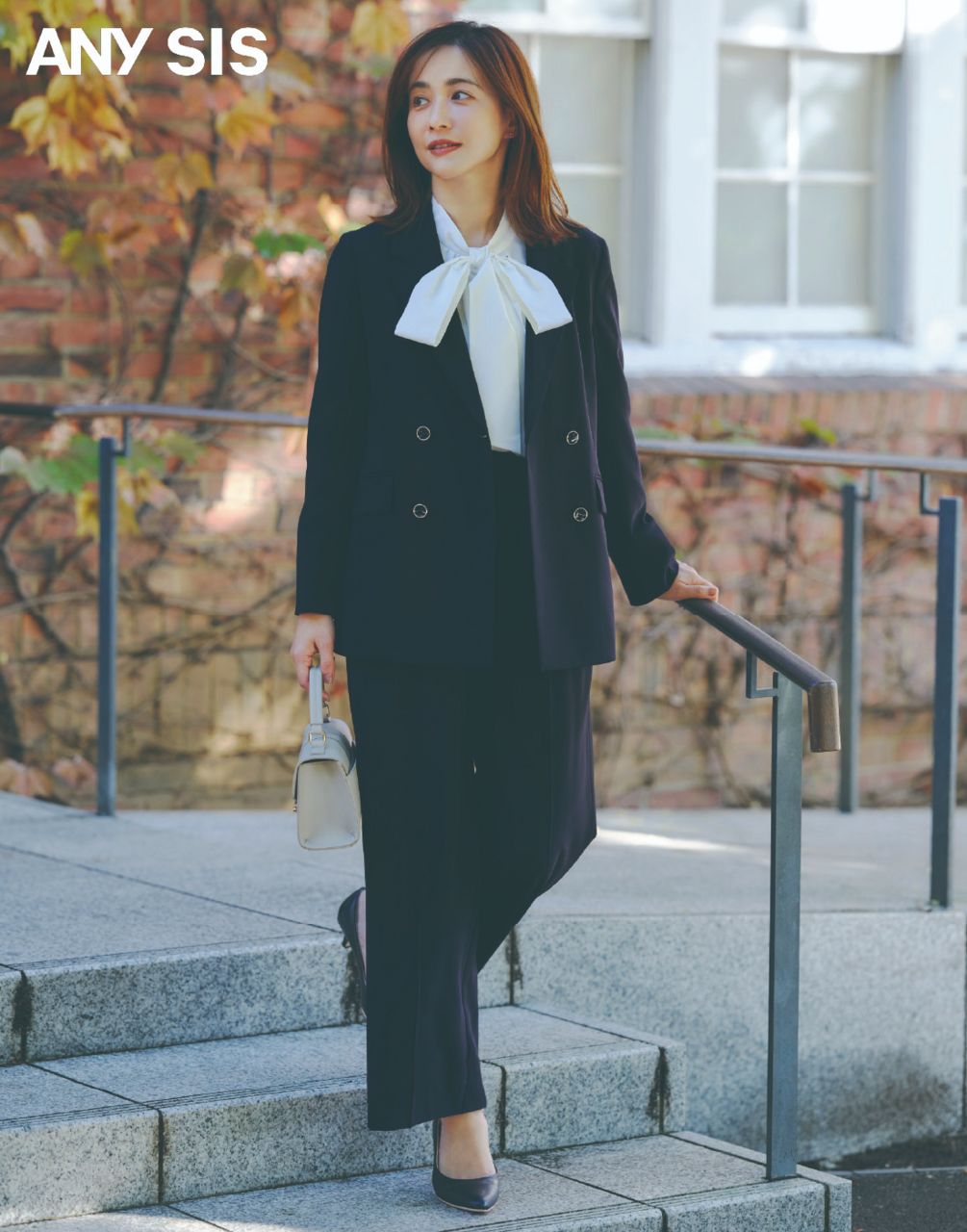 今っぽいシルエットのWジャケットに、ボウタイブラウスで華やかさをプラス、シルエットをカバーしてくれるワイドパンツで格好良いスタイルの完成。