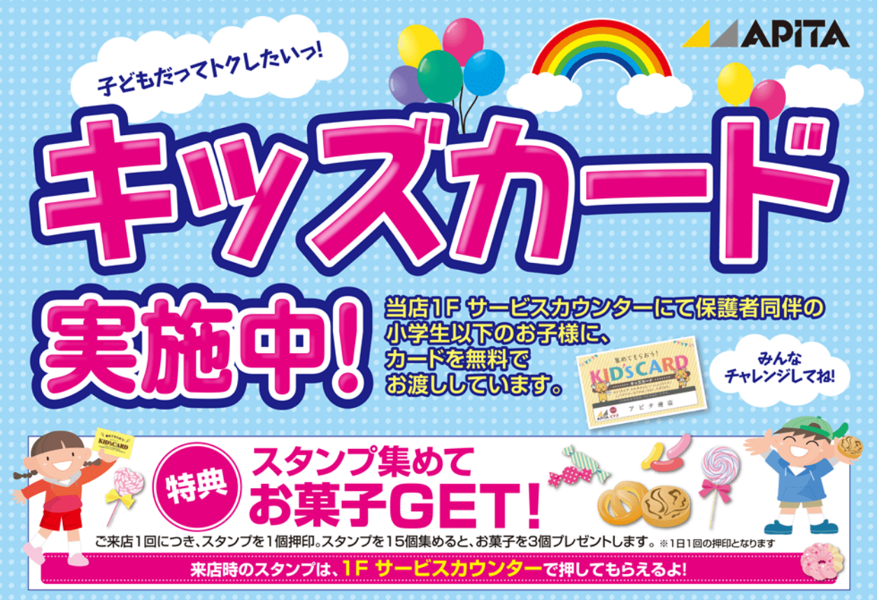 ご注文もしくはお会計時にキッズカードをご掲示いただくと、対象店舗でオトクに買い物をしていただけます。