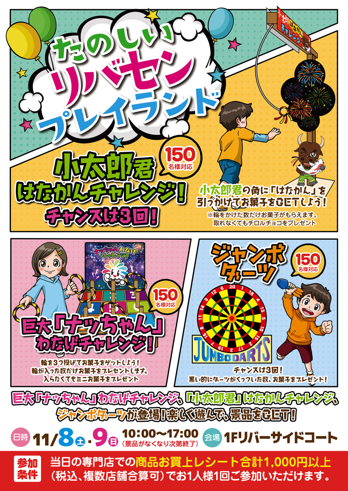 巨大「ナッちゃん」わなげチャレンジ、「小太郎君」はなかんチャレンジ、ジャンボダーツが登場!