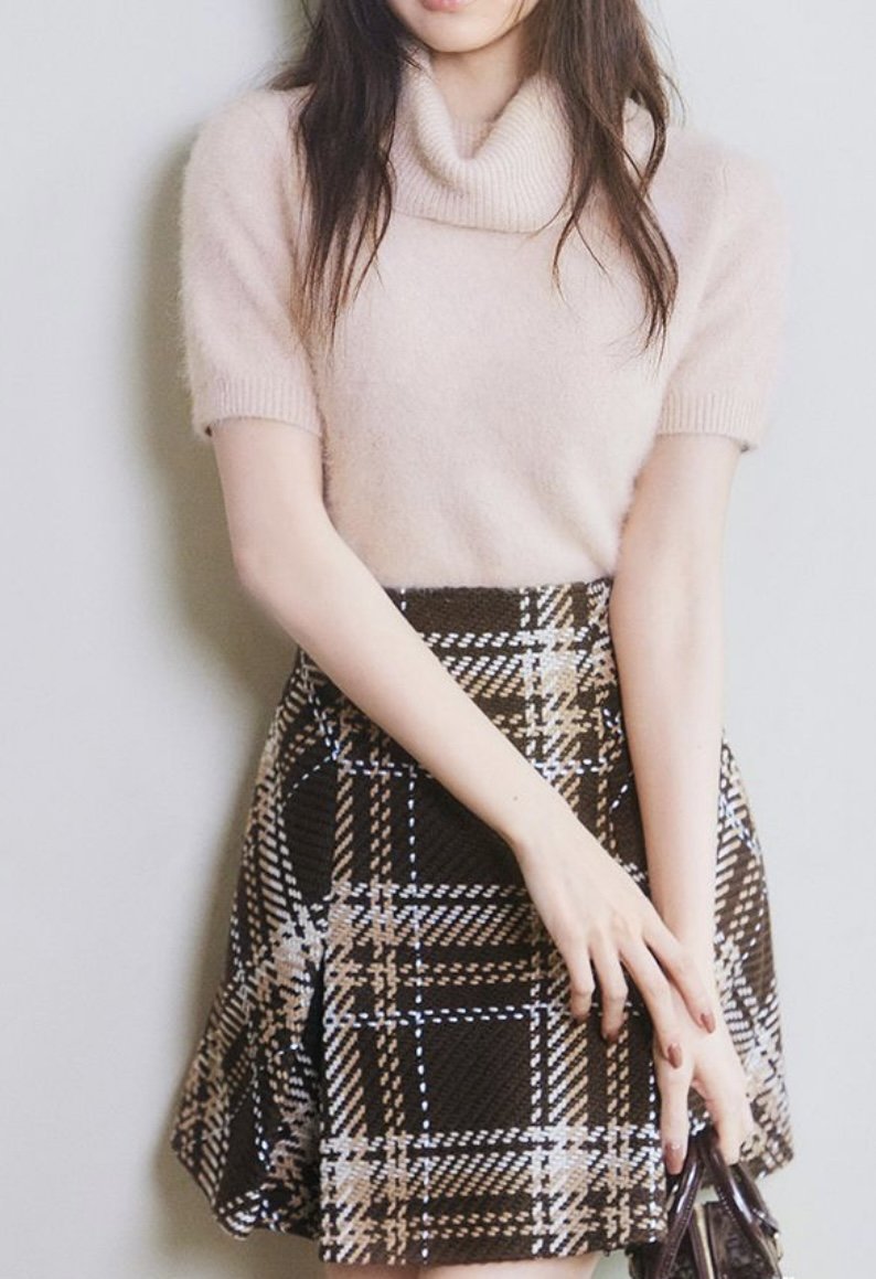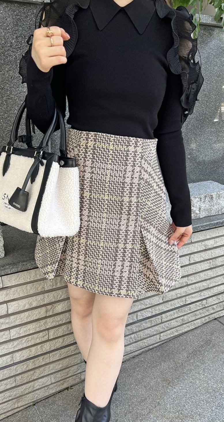 大人気のロービングチェックミニスカートを今季らしくアップデート。シーズンムード溢れる華やかな色味のロービングヤーンを使用し、クラシカルなルックスがスタイリングの品を高める1着です。今回はカラーにより異なる柄を採用し、それぞれ印象を変えてお作りしました。アイボリーは、ネイビーとブラウンを利かせた清楚な大柄チェック。ブラウンは定番人気の大柄チェック柄です。艶感のある水色の差し色を利かせた配色が魅力です。ピンクは細かい千鳥柄をベースに仕上げており、きちんと感がありながらも華やかなアイテムに仕上がりました。サイドの生地をバイアス使いにしてモードな印象にしつつ、視覚効果でスタイルアップも。シルエットはいつもよりややフィット感を出し、トップスをインしてもスッキリと着こなせるハイウエスト仕様で、脚長効果も期待できます。リサイクルポリエステルを使用したサスティナブル素材でのお作りです。背中側のファスナーで着脱いただけます。