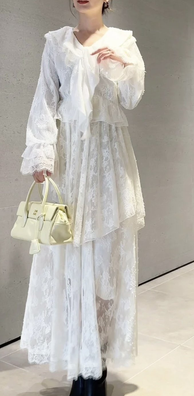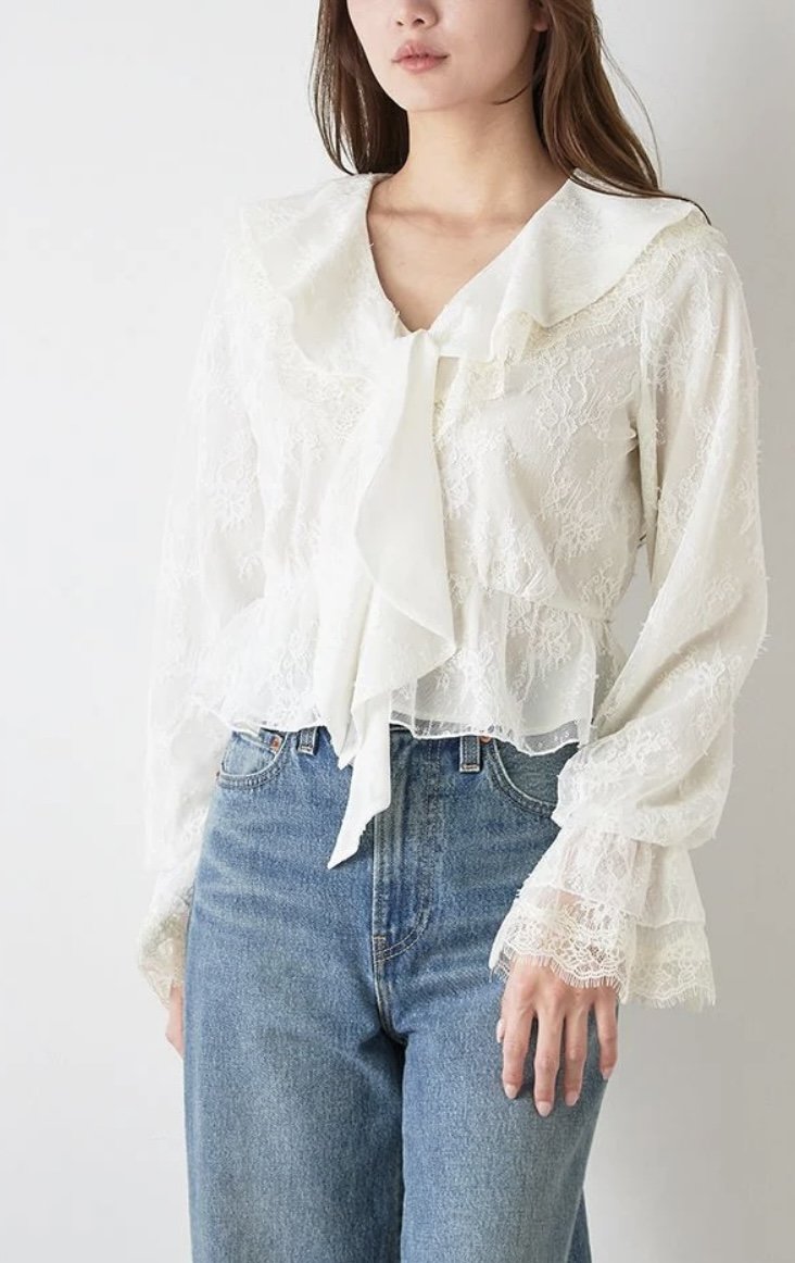 総レースや、シルバー箔プリントを施したシフォン生地、コットン見えする軽やかなシフォン生地など、シアー感のある表情の異なる3種類の生地でお作りしたバリエーションフリルブラウスお目見え。広く開いた襟ぐりにはたっぷりとラッフルフリルを施し、共布のスカーフリボンをプラスして動きを出し、華やかに仕上げました。ウエストにはギャザー切替えを入れ、自然に広がるペプラムシルエットを形成してスタイルアップ効果も抜群です。ウエストには細い共リボンが付いており、後ろで結んでサイズ調整ができます。袖口にもゴムを入れ、ふんわりとボリュームを出してエレガントに仕上げました。被りでご着用いただけます。キレイめなワイドパンツに合わせたり、カジュアルなデニムに合わせたり、同色・同素材でお作りしているバリエーションティアードスカートとセットでのロマンティックなスタイリングもおすすめです。