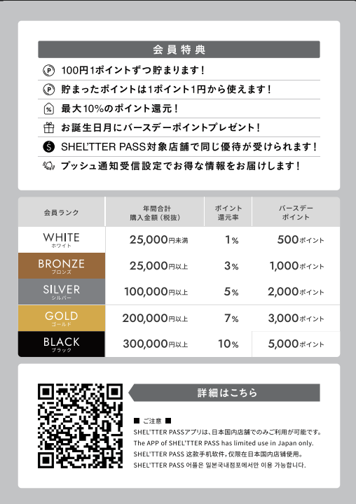当店でもご利用いただけるショッピングアプリ「SHEL'TTER PASS(シェルターパス)」の会員ランクが2026年3月1日よりアップデートいたしました。