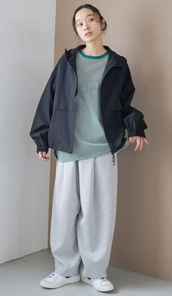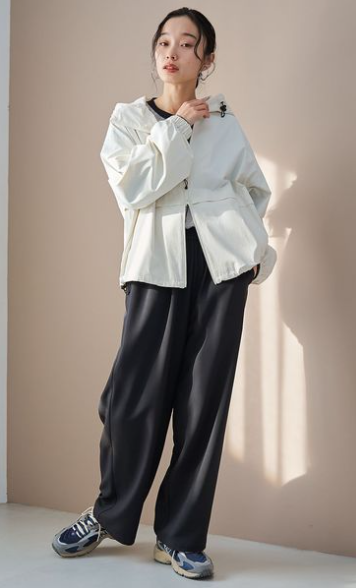 コンパクトなシルエットなので、ボトムにはバルーンパンツなどボリュームのあるアイテムとの合わせが◎