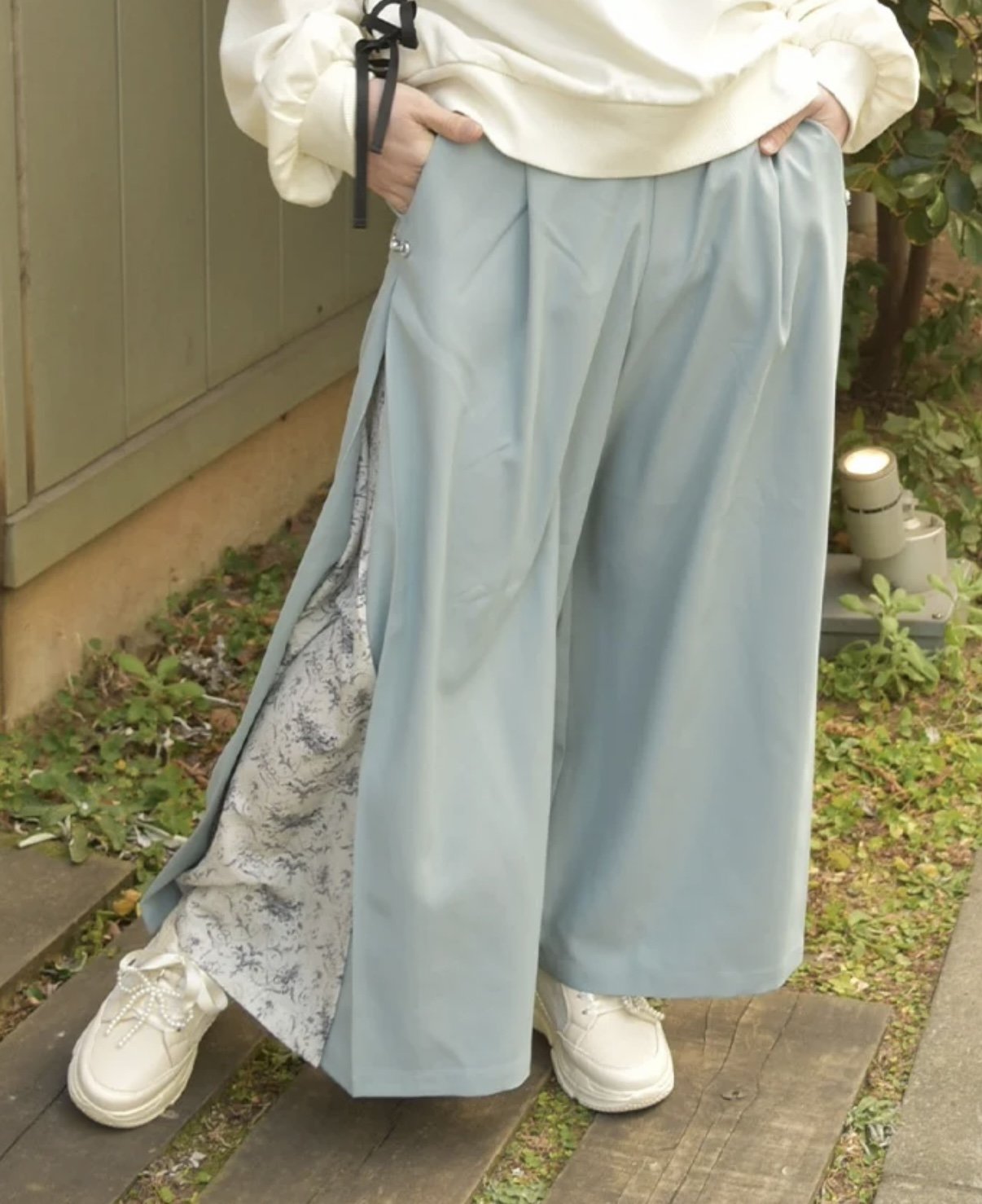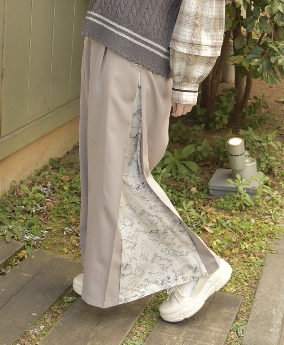 歩くたびに両サイドから覗く、柄切替がポイントのワイドパンツ。