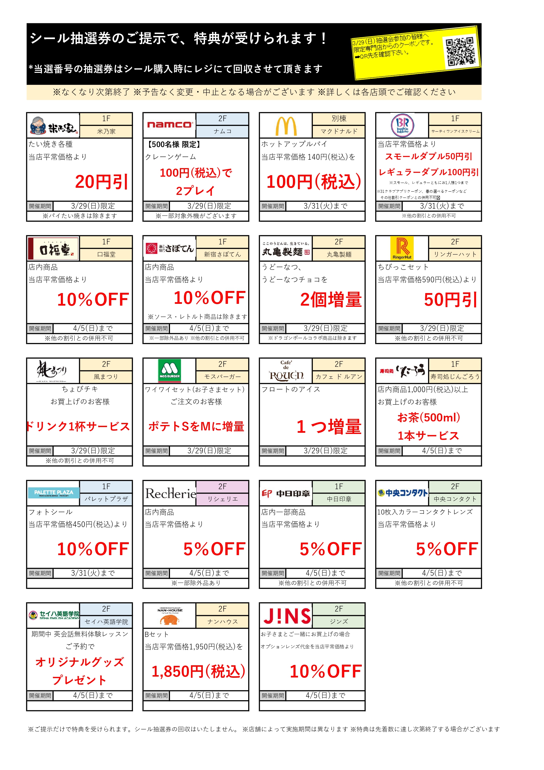 お知らせ テラスウォーク一宮 お知らせ シール抽選販売会クーポン一覧 シール抽選販売会クーポン一覧 2026/03/26 掲載 3/29(日)開催のシール抽選販売会クーポン一覧です。当日9時より配布予定の”シール抽選販売券”の裏面がクーポンになります。対象専門店でご提示いただきますと特典が受けられます。 お知らせ一覧