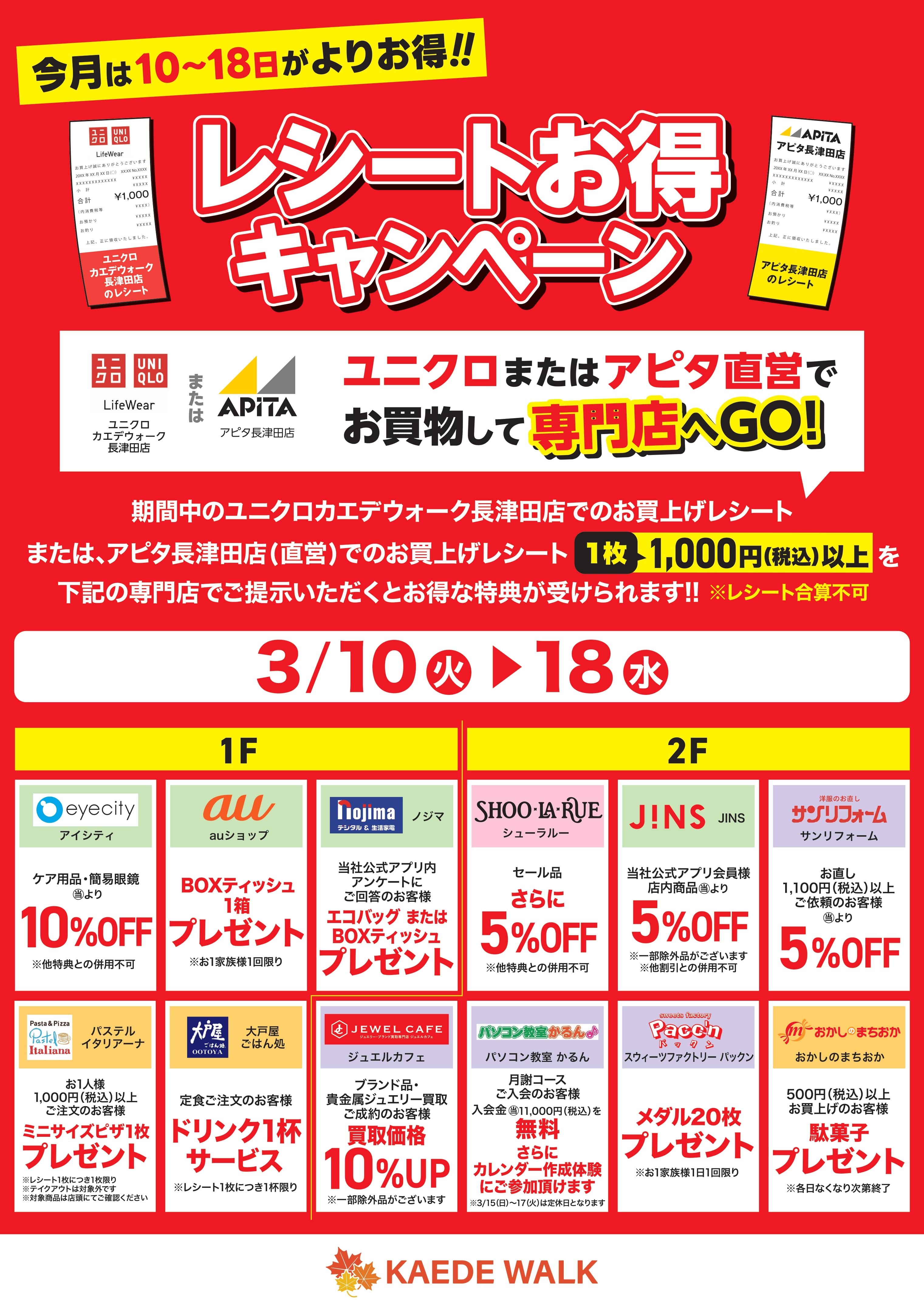 【今月は10日▶18日がよりお得!レシートお得キャンペーン】ユニクロまたはアピタ直営でお買物して専門店へGO!お買上げレシート 1枚1,000円(税込)以上をご提示でお得な特典!