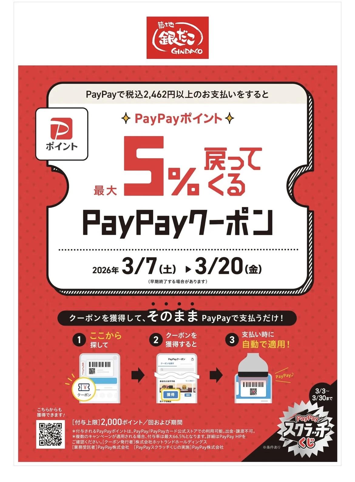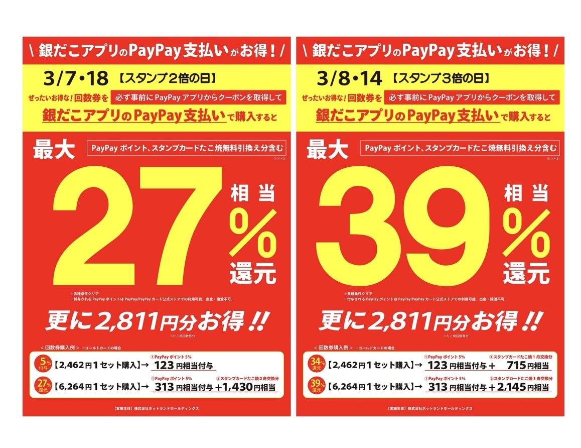 ※「銀だこアプリ」 でも PayPayでのお支払いが可能です。ご利用には、事前にアプリのダウンロード・会員登録およびアプリ内での PayPay連携手続きが必要となります\ 最大にお得な日は! 3月8日 と、 3月14日! /
