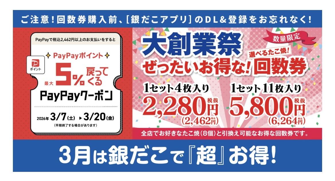 今回の 『ぜったいお得な!回数券』 を、“最もお得” にご購入いただく方法は、①スタンプが “3倍” となる 3月8日(日)と14日(土)に、②PayPayクーポンを事前に獲得 し、③対象店舗にて、 PayPay にて決済・ご購入 いただくと、決済額の最大 5%相当の PayPay ポイント付与に加え、銀だこスタンプカードのスタンプも 3倍獲得ができ、一気にランクアップやたこ焼が無料でもらえる “ビッグチャンス” です!!