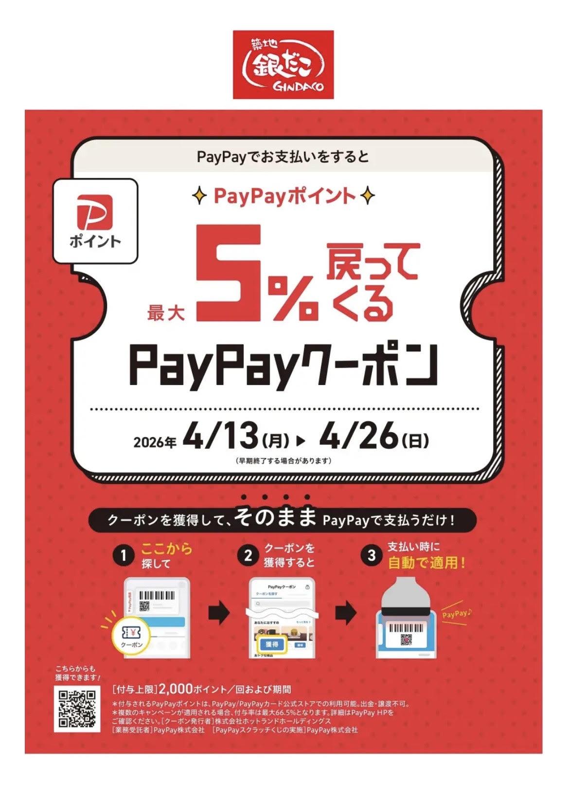 日本国内のみならず、米国ロサンゼルス・ドジャースのホームスタジアム(ドジャー・スタジアム)にも出店しているたこ焼チェーン 築地銀だこ を展開する 株式会社ホットランドホールディングス (本社:東京都中央区、代表取締役社長:佐瀬守男)は、「築地銀だこ 公式アプリ」(以下、「銀だこアプリ」 という) の会員が100万人を突破したことを記念し、日頃からご愛顧いただいております皆様へ感謝を込めて、2026年4月6日(月)から19日(日)まで、 “お好きなたこ焼100円引き” のクーポン(銀だこアプリ内クーポン)をプレゼントいたします!さらに!4月13日(月)から26(日)までの期間、PayPayでお支払いすると、お会計額の最大5%がPayPayポイントとして戻ってくるPayPayクーポンも配布!「銀だこアプリ」 をダウンロード&会員登録し、アプリ内でPayPay連携&PayPayクーポンの利用で、お会計もスムーズで、お得にもなる大チャンス!今後さらに使いやすく、お得になる 「銀だこアプリ」 !ぜひこの機会に、ご利用ください!【銀だこアプリ内でのPayPay連携でお会計もスムーズでお得!】
